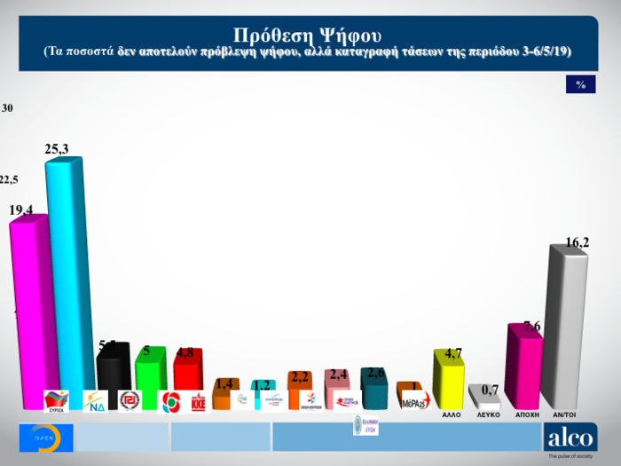 ALCO Δημοσκοπήσεις και έρευνες αγοράς. Σύμφωνα με τη δημοσκόπηση του Open στην πρόθεση ψήφου η ΝΔ συγκεντρώνει 38 έναντι 235 για τον ΣΥΡΙΖΑ 66 για το ΚΙΝΑΛ 55 για το ΚΚΕ 46 για την Ελληνική Λύση και 33 για το ΜέΡΑ25. Διατηρεί το διψήφιο προβάδισμά της η Νέα Δημοκρατία έναντι του ΣΥΡΙΖΑ σύμφωνα με νέα δημοσκόπηση της εταιρίας Alco για λογαριασμό του τηλεοπτικού σταθμού OPEN.